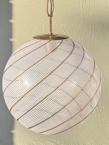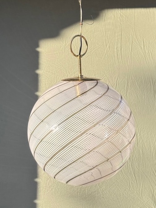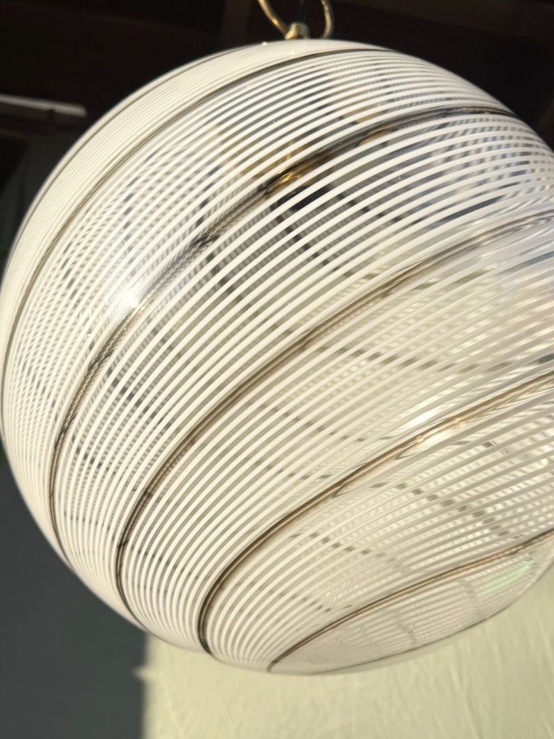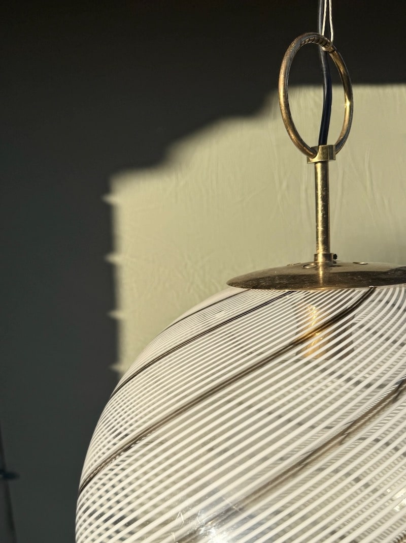 Helt særlig og stor Murano loftlampe i det fineste vintage glas, mundblæst og meget smukt udført. Lampen er formet i klar glas, hvid glas og med en smal brun stribe.