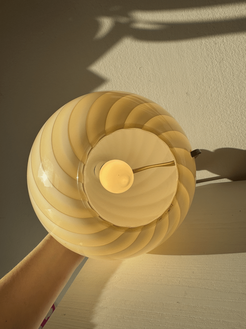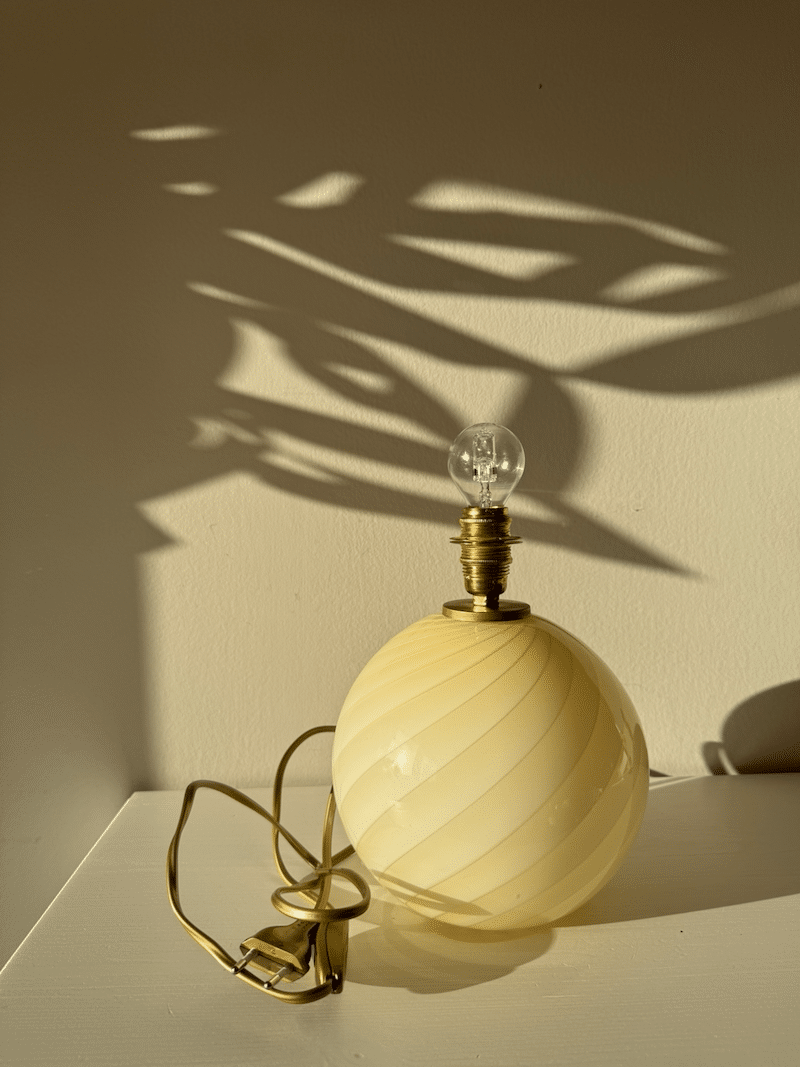 Vintage lampe fra Italien, ca 1970. Glasset og swirl fremstår perfekt og super flot stand. Lampen har monteret en ledning i guldfarve. Der er lys på “op” og “ned” i lampen, så den kan lyse både gennem lampeskærm – og ned i glasset, så den gule farve fremstår endnu varmere.