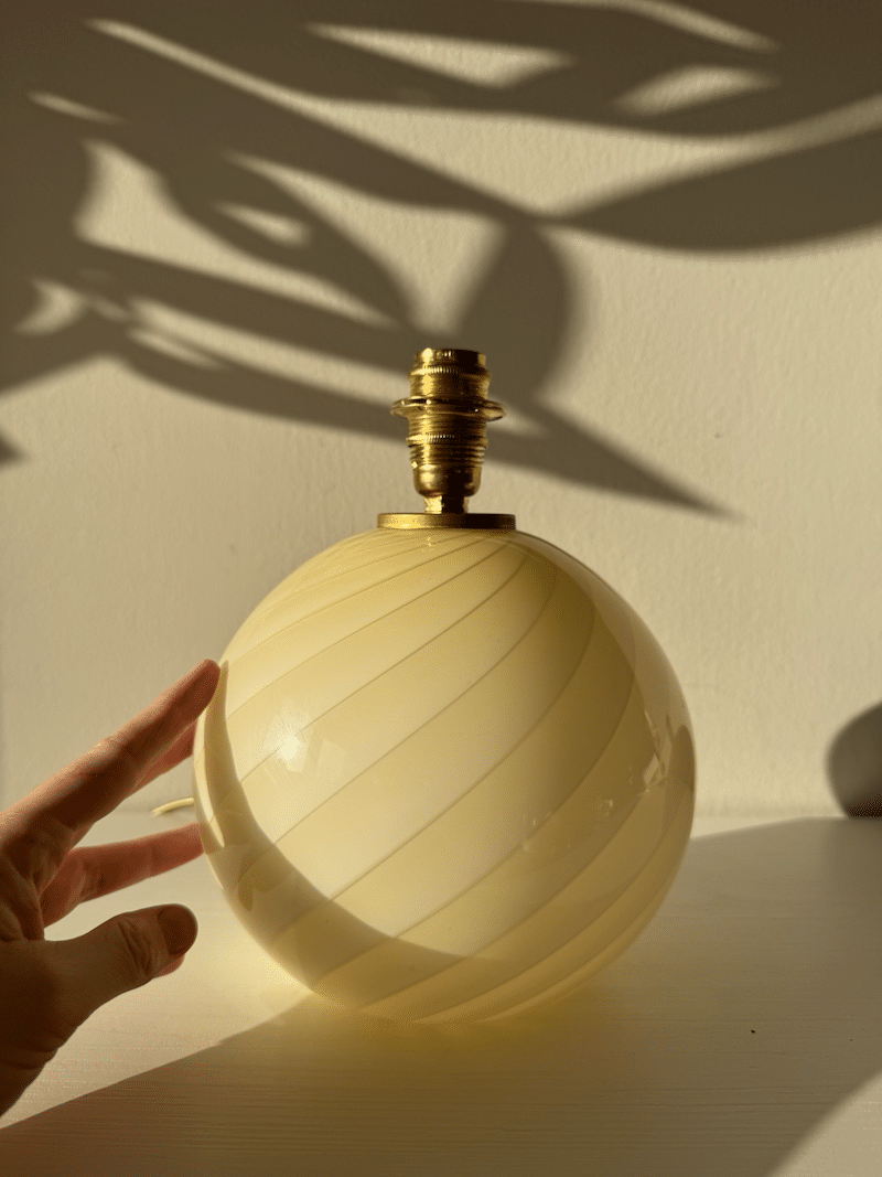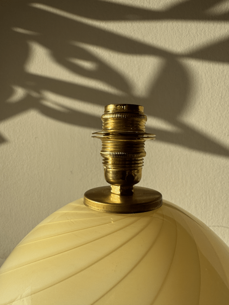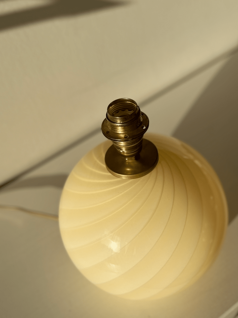 Gul swirl Murano lampefod. Kugleform og med monteret fatning i messing.