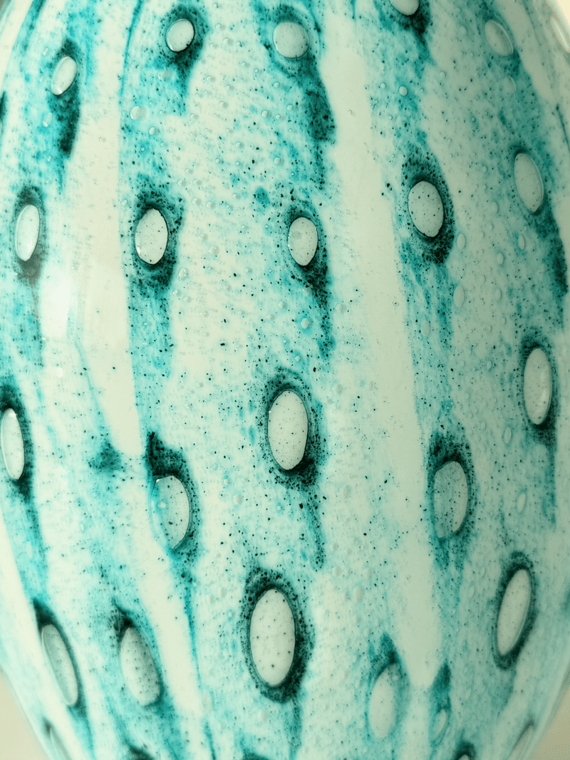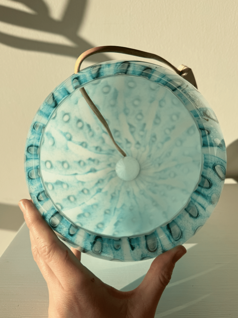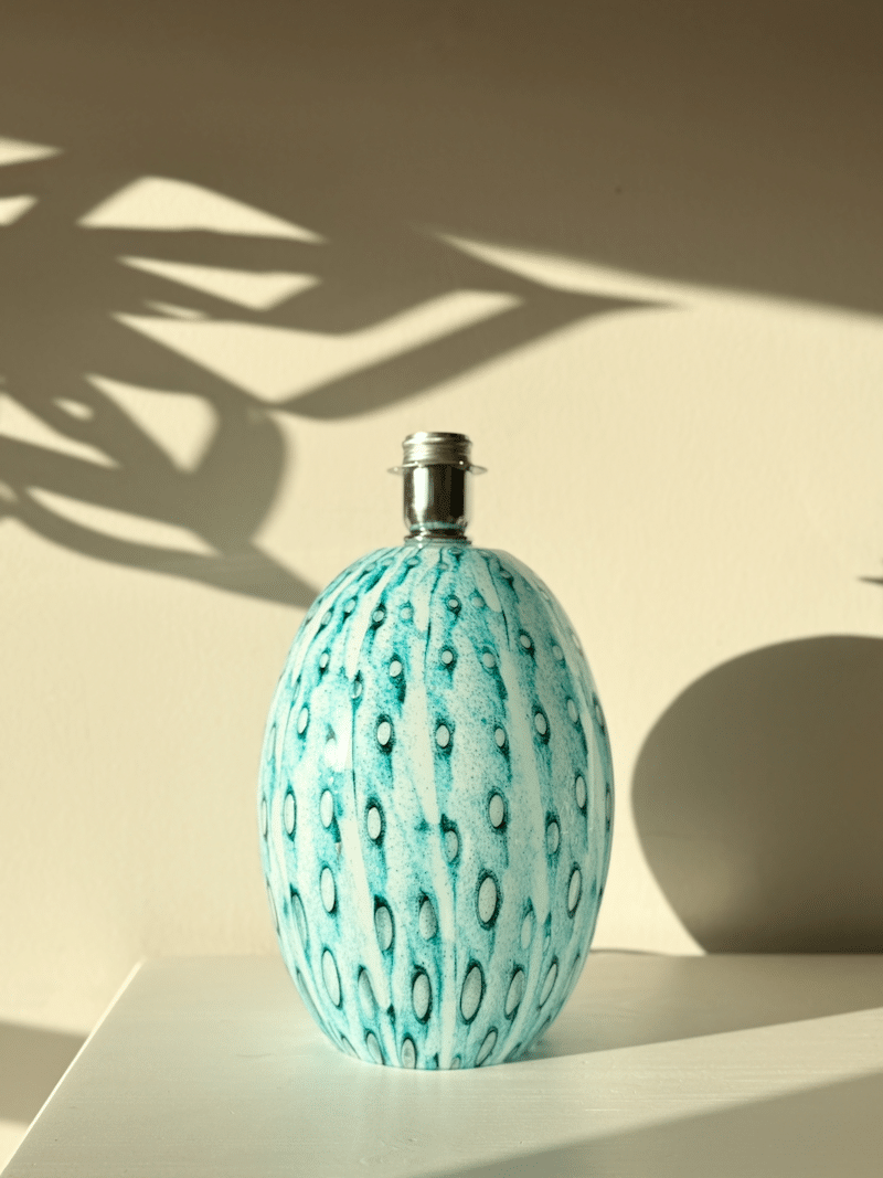 Lampen har mulighed for lys øverst i lampen og lys, der skinner ned i glaset. Det giver en super smuk effekt med fx en svar pære i nederste fatning, som giver lyst igennem lampefoden. Samtidig kan sætter lys i lampen på traditionel vis. Den vil blive super smuk med en håndlavet farverig lampeskærm – eller bare en ensfarvet for et mere afdæmpet look.