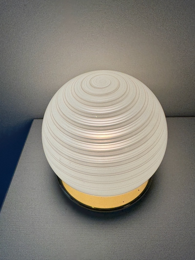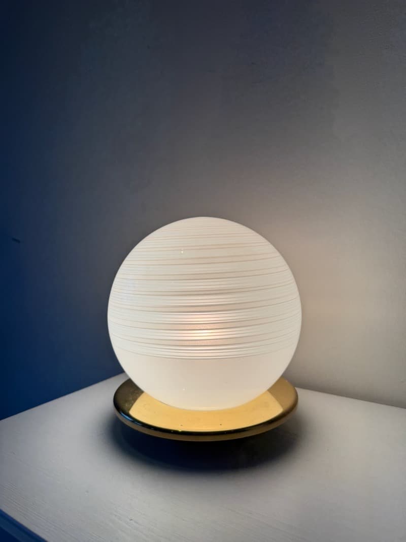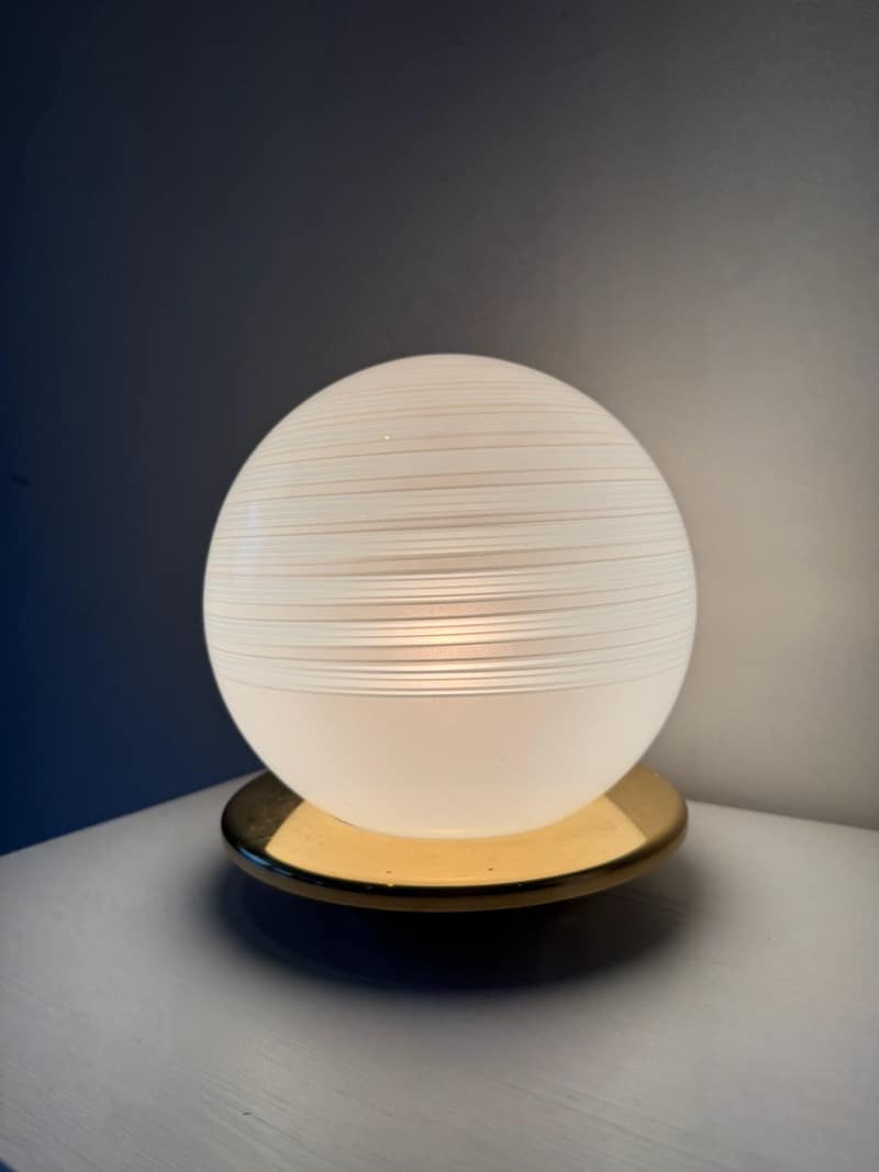 Mundblæst kuppel i Murano glas, monteret på fod i messing. Selve glaskuplen måler 20 cm i diameter og sender det blødeste lys ud i rummet.
